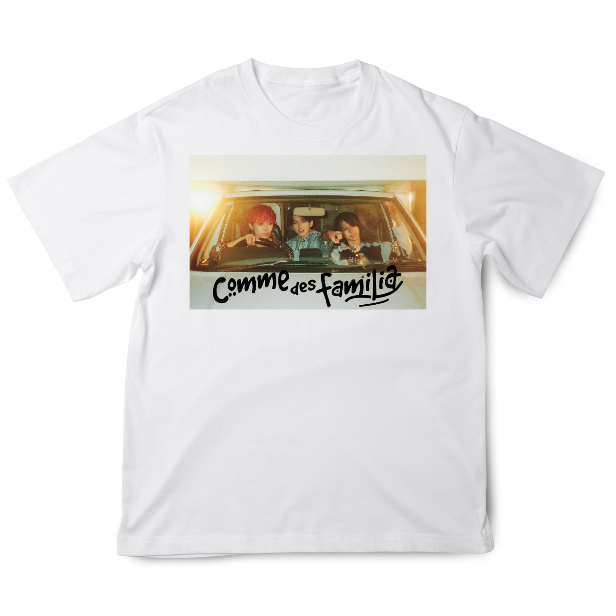 新しいスタイルを楽しむためのCDF T-SHIRT Cが登場です!このTシャツは、クリーンなホワイトのボディに、車の中に乗ったメンバーのプリントとロゴが配されたデザインが特徴です。フロントのグラフィックは、思い出を感じさせ、見る人の心を掴むこと間違いなしです。フリーサイズはXL相当で、リラックスした着心地を提供し、様々なシーンで活躍します。